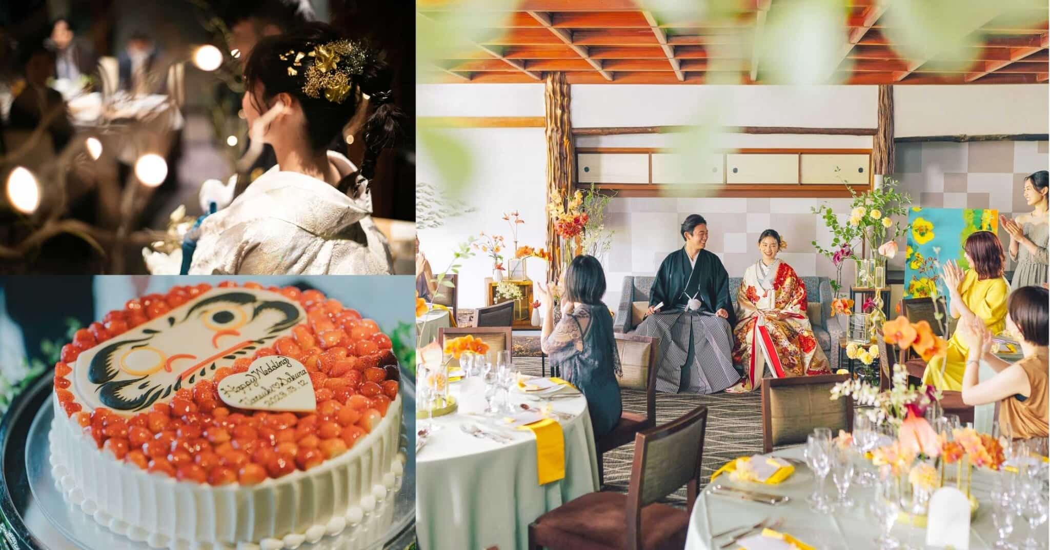 ウェルカムアイテムとして和装前撮りの写真を飾ったり、ウエディングケーキを和モチーフにしたりするアイデアも人気です。